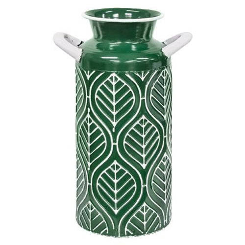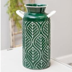 Leaf Enamel Milk Can is made of enamel and features a deep green, matte finish with two white handles for detail and easy carrying. Can is accented by geometric leaves that have been embossed into the sides. Measures 12.5” high by 5.5” in diameter.